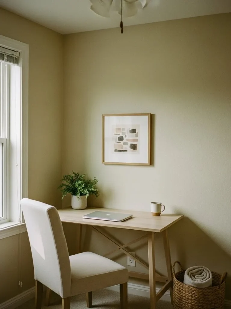 This cozy little office nook is all about soft sand toned walls paired with light wood furniture and simple, calming decor. The paint color feels warm without leaning yellow, which makes the space feel bright but still grounded. Natural light filters through sheer curtains, bouncing gently off the neutral walls and keeping everything airy and fresh. Clean lines, a compact desk, and a tucked in bookshelf make the whole setup feel intentional and uncluttered, perfect for a small corner that still wants to feel styled and serene.