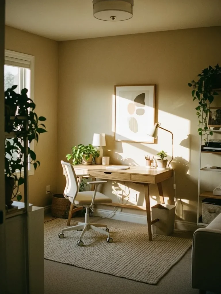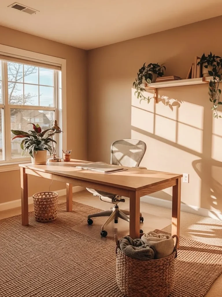 This home office leans into soft warm beige walls that glow beautifully in natural light, creating a calm and cozy backdrop that feels instantly welcoming. The light wood desk keeps things airy and uncluttered, while the creamy white chair adds a subtle contrast without breaking the softness of the palette. Simple decor choices like the framed abstract art, woven rug, and leafy green plants give the space a relaxed lived in feel that still looks Pinterest perfect. Everything feels intentional but not overstyled, which makes the room feel functional and soothing at the same time.
