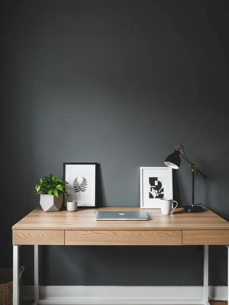 This home office leans into a deep charcoal wall that instantly makes the space feel calm and grounded. The warm wood desk softens the dark paint and adds just enough contrast to keep things inviting. Clean lines and simple styling give it that modern minimalist vibe without feeling cold or bare. A sleek black desk lamp and framed art keep the look intentional while a small plant adds a fresh pop of life. Everything feels balanced and uncluttered which is perfect for focus.
