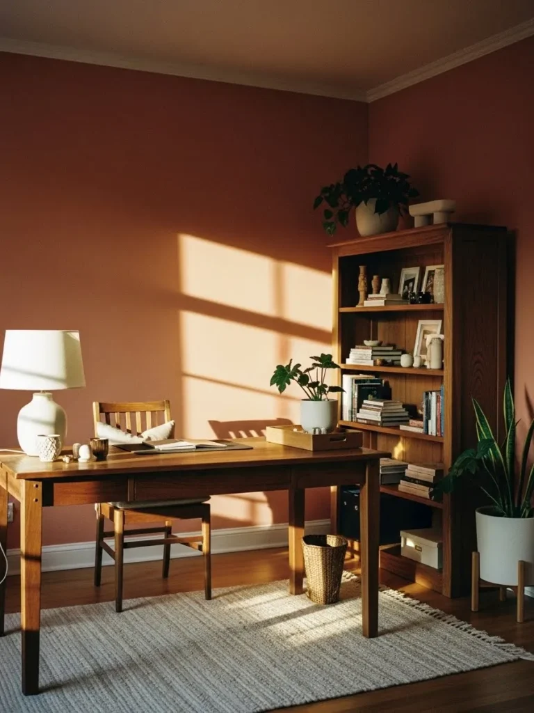 This home office wraps the room in a cozy terracotta tone that instantly feels warm and grounded without being heavy. The paint has that sun baked softness that plays beautifully with the natural light streaming across the walls. Simple wooden furniture keeps the space feeling calm and unfussy while layered textures like the woven rug, leafy plants, and open shelving add just enough visual interest. Everything feels intentional but relaxed, like a room designed to be used and enjoyed rather than just styled for photos.