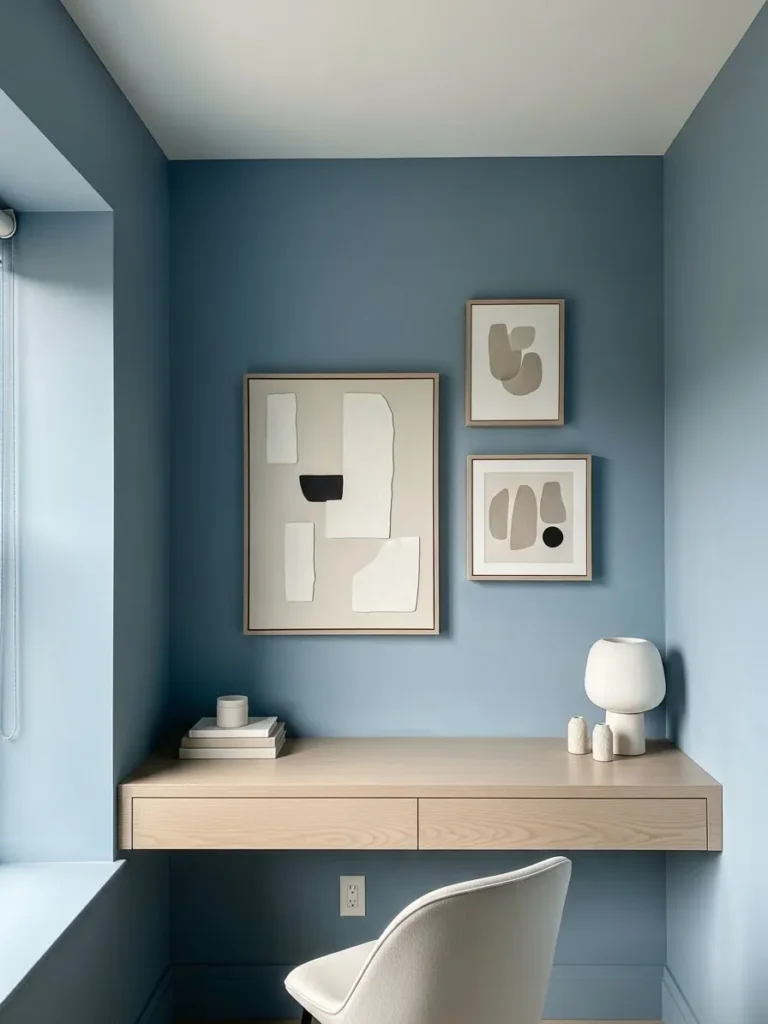 This home office features a calm muted blue wall color that instantly makes the space feel airy and relaxed without being boring. The built in floating desk in light wood keeps everything looking clean and uncluttered while still feeling warm and welcoming. Abstract art in soft neutrals adds just enough visual interest without overpowering the room. The simple chair and sculptural lamp keep the look modern yet cozy and the natural light from the window makes the color feel even softer and more inviting.
