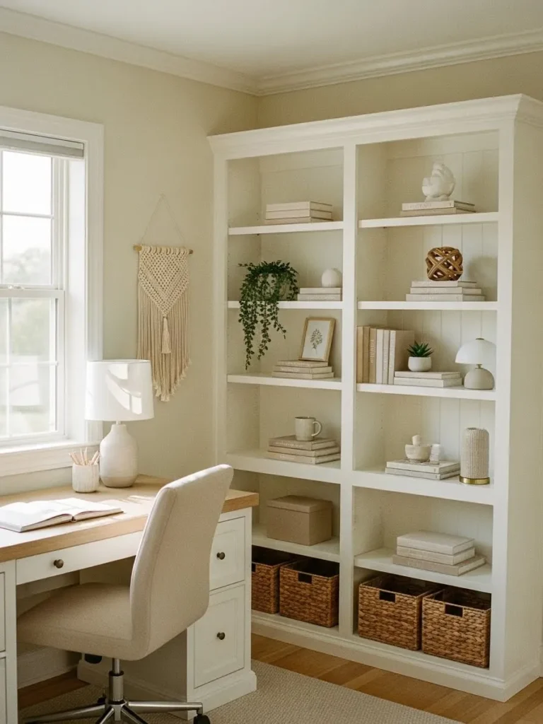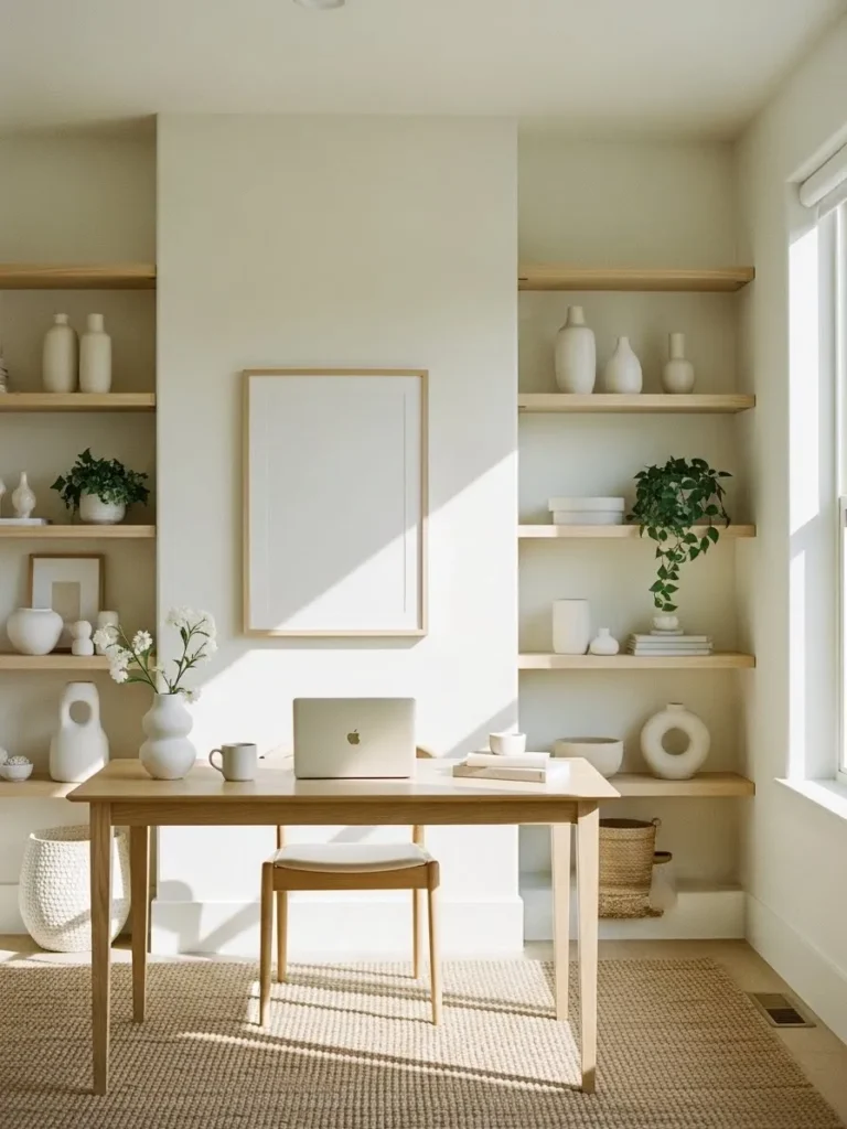 This home office feels airy and calm thanks to its soft cream walls and beautifully balanced styling. The light neutral paint reflects natural sunlight in the most flattering way, making the whole space feel open and peaceful without looking cold. A simple wooden desk anchors the room while built in shelves add warmth with pale wood tones and thoughtfully placed decor. The ceramics, greenery, and woven textures keep everything feeling cozy and intentional rather than sparse. It is the kind of space that feels uncluttered but still full of personality.