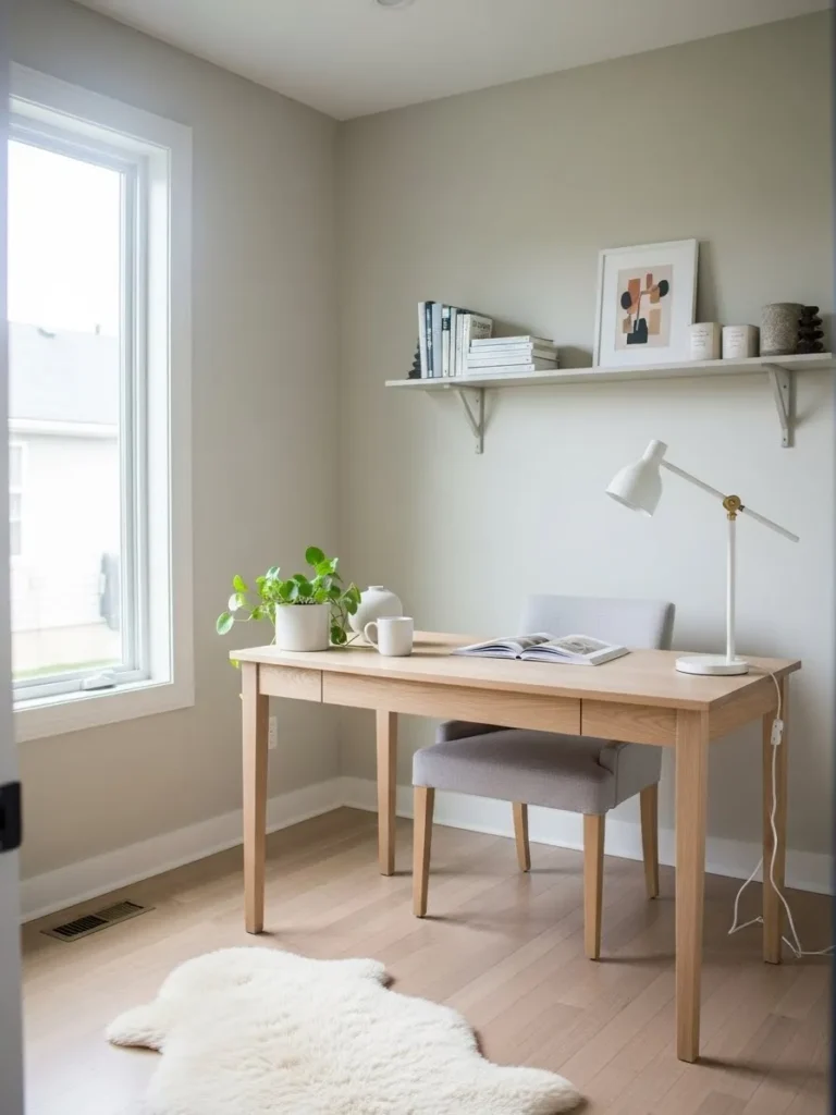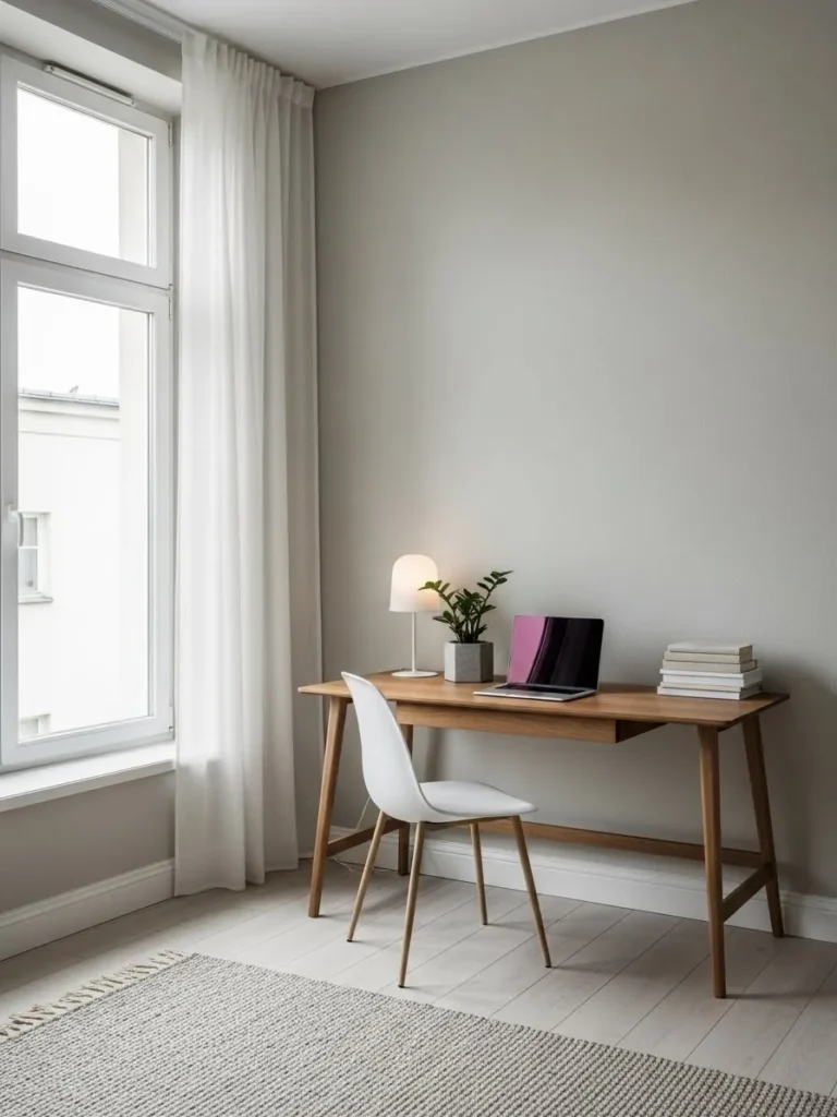 This home office leans into a soft stone paint color that feels calm, airy, and quietly stylish. The light gray walls have a warm undertone that keeps the space from feeling cold, especially when paired with the natural wood desk and pale flooring. Sheer white curtains filter in natural light, making the room feel bright without glare, while simple accessories like stacked books, a small plant, and a soft-glow table lamp keep everything looking intentional but unfussy. The overall look is clean, Scandinavian-inspired, and perfect for small spaces that still want to feel polished.