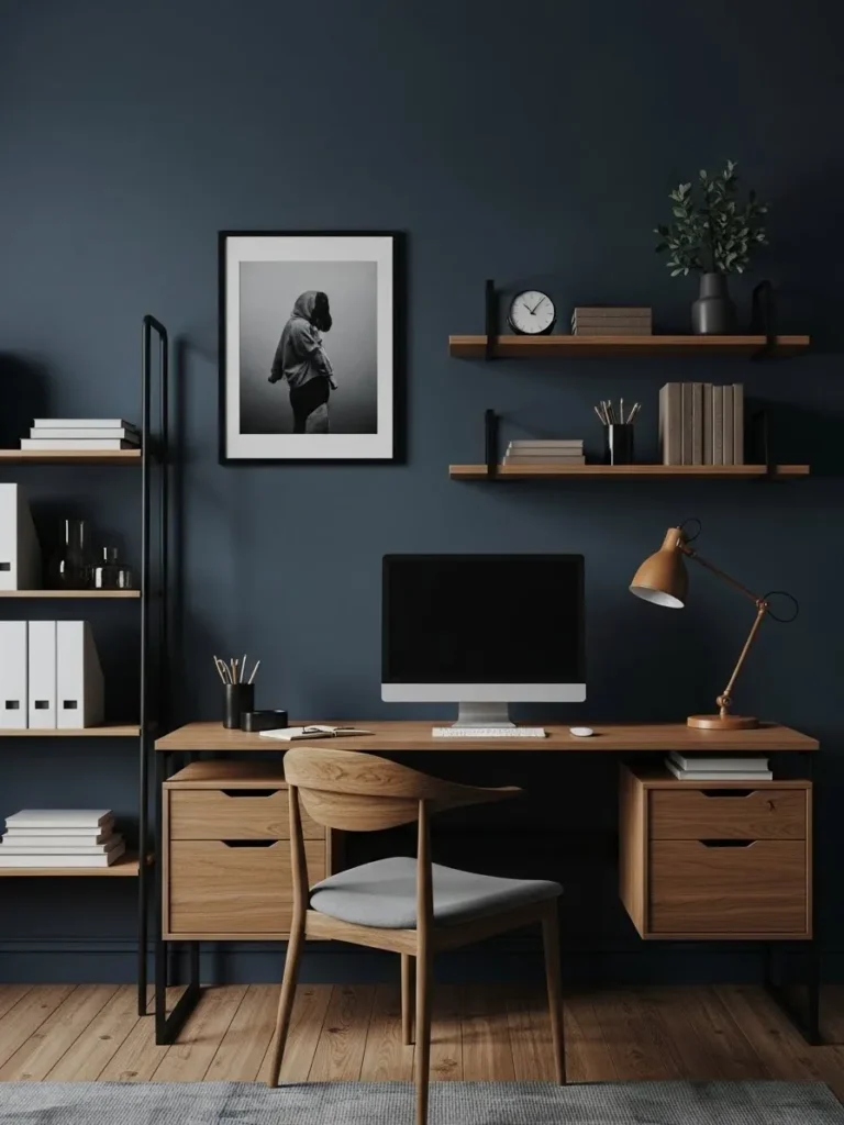 This home office leans into a deep navy blue wall color that instantly feels calm, cozy, and a little dramatic in the best way. The dark backdrop makes the warm wood desk and shelving pop beautifully, while the clean lines keep everything feeling modern and uncluttered. Floating shelves styled with books, simple decor, and a touch of greenery add interest without overwhelming the space. The mix of matte finishes, soft lighting, and natural textures creates a workspace that feels intentional, stylish, and very Pinterest worthy.
