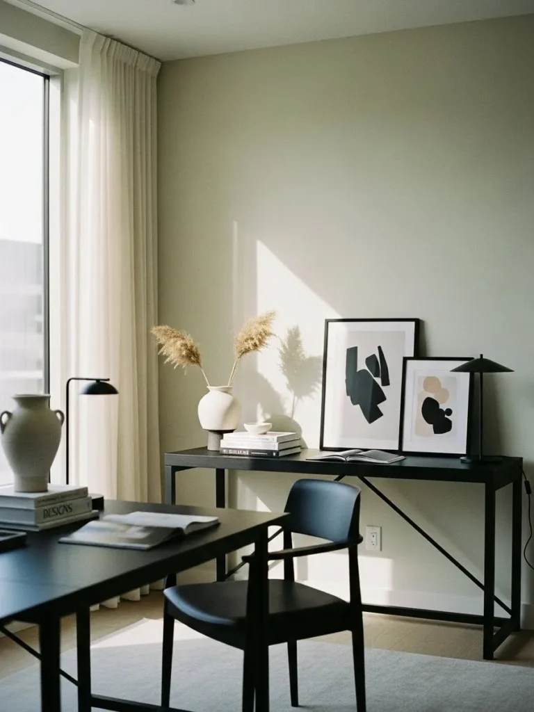 This home office is all about calm, clean lines, and that perfectly muted sage green wall that instantly softens the entire space. The color feels fresh without being loud, and it plays beautifully with the black furniture and simple silhouettes. Natural light pours in through the tall window, bouncing gently off the pale walls and creamy curtains, while the styling stays intentionally minimal with framed abstract art, sculptural vases, and just enough decor to feel curated but not cluttered. It’s the kind of space that feels modern, airy, and quietly stylish without trying too hard.