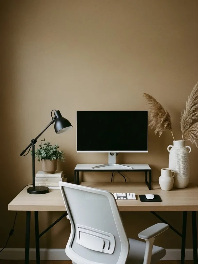 This home office keeps things beautifully simple with a warm sand paint color that instantly softens the entire space. The walls have that cozy beige brown undertone that feels grounded without going dark, making it perfect for everyday work. A light wood desk paired with black metal legs adds just enough contrast, while the white office chair keeps everything feeling airy and fresh. The styling is minimal but thoughtful, with a matte black task lamp, neutral ceramics, dried pampas grass, and a touch of greenery that brings the whole setup to life without cluttering the desk.
