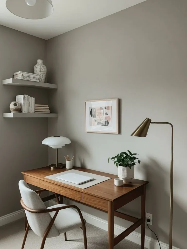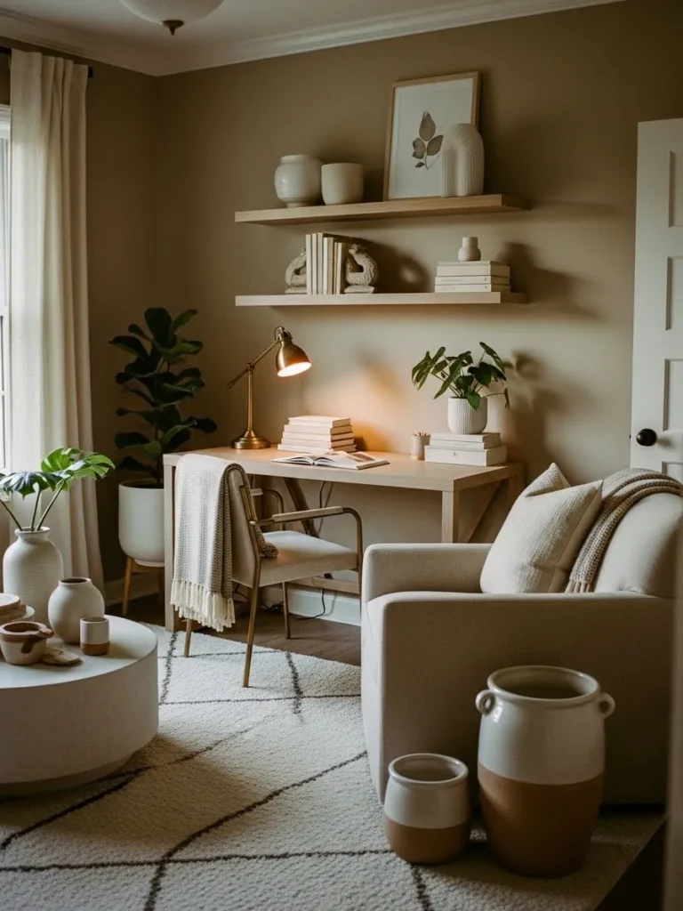 This home office leans into a soft greige wall color that instantly makes the space feel calm and grounded. The paint sits right between warm beige and gentle gray which makes it incredibly Pinterest friendly and easy on the eyes. Light wood shelves float effortlessly against the wall and are styled with neutral ceramics books and simple art that feels curated but not fussy. A compact desk tucks neatly into the corner paired with a cozy upholstered chair while plants add just enough greenery to keep the room feeling fresh and lived in. Everything feels balanced warm and intentionally uncluttered.