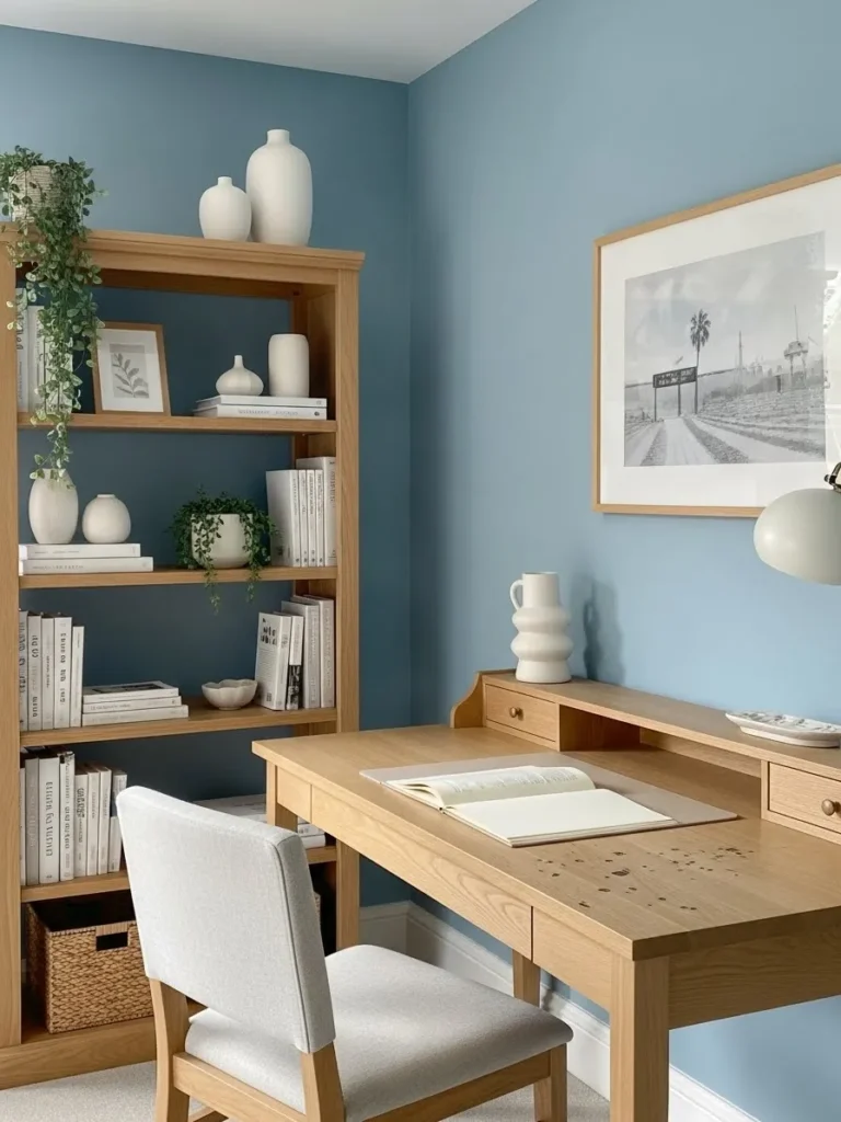This home office pairs soft powder blue walls with light oak furniture for a calm and airy look that instantly feels welcoming. The paint color has that perfect Pinterest friendly balance where it feels fresh without being cold and cozy without feeling heavy. Natural wood shelves bring warmth while simple white ceramics and trailing greenery add texture without clutter. The overall design feels clean and intentional with plenty of visual breathing room which makes it ideal for a focused but relaxed workspace.