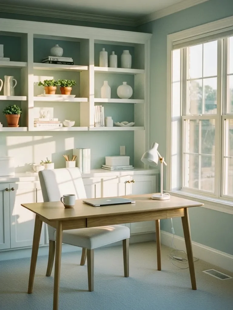 I honestly love this kind of office because it feels like a deep breath every time you walk in. The blue is soothing in a way that makes long work sessions feel lighter and less stressful. I would happily sit here with my coffee pretending I am super productive while actually just admiring how pretty everything looks. It is the kind of space that makes you want to keep things tidy because the room itself deserves it.