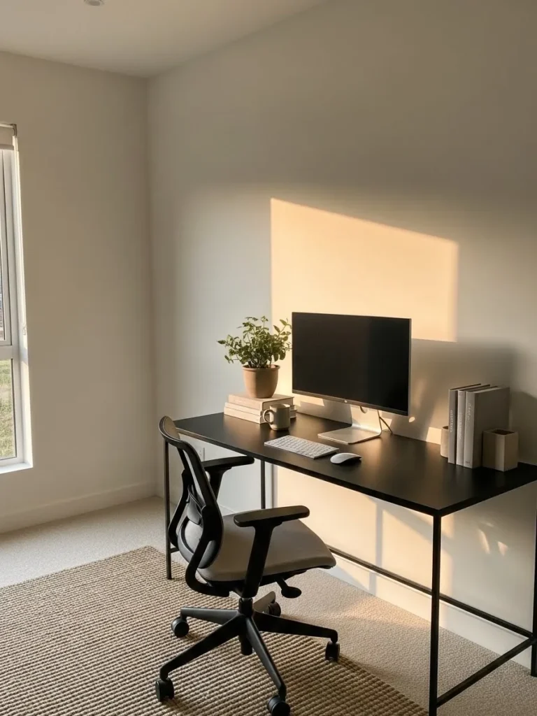 This home office features soft greige walls that feel calm, airy, and perfectly balanced between warm and cool. Natural light pours in through the window and creates those cozy sun patches that make the space feel alive throughout the day. The black desk adds contrast without feeling heavy, while the simple chair and clean-lined accessories keep everything looking intentional and uncluttered. A small plant and a few neutral books bring in just enough warmth to stop the room from feeling flat, and the overall vibe is minimal without being cold.