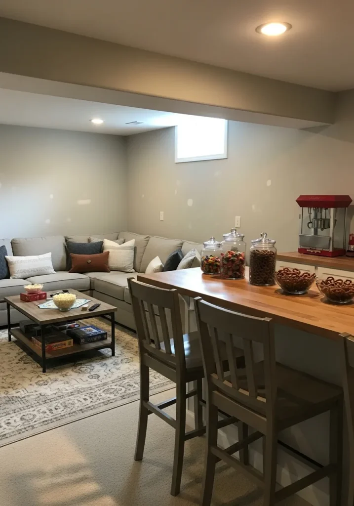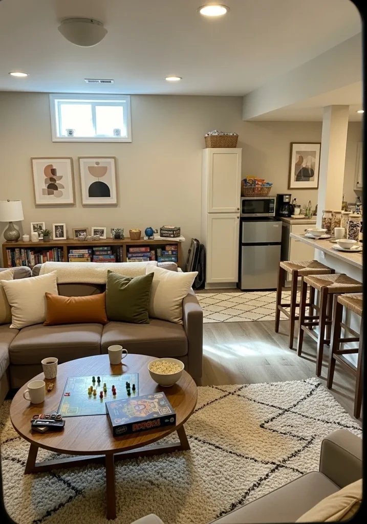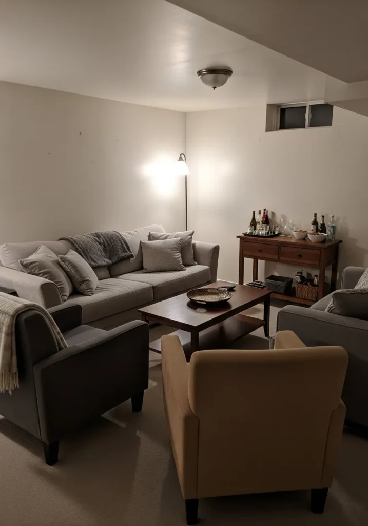 Warm Gray Basement Living And Hosting Area