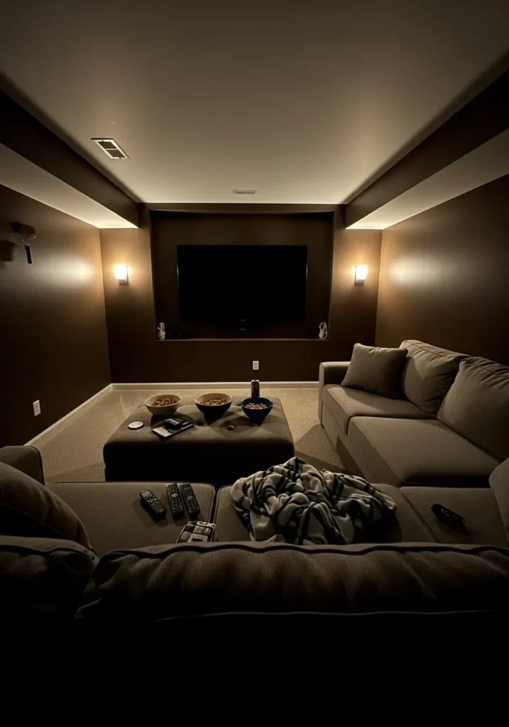 This basement theater lounge is painted in a deep warm tone that instantly sets a cozy mood. The darker walls help focus attention on the screen while keeping the space intimate. Soft accent lighting adds just enough glow.