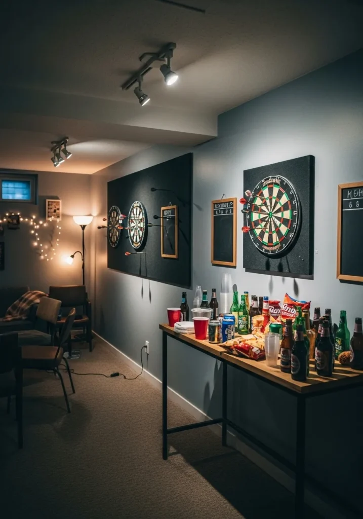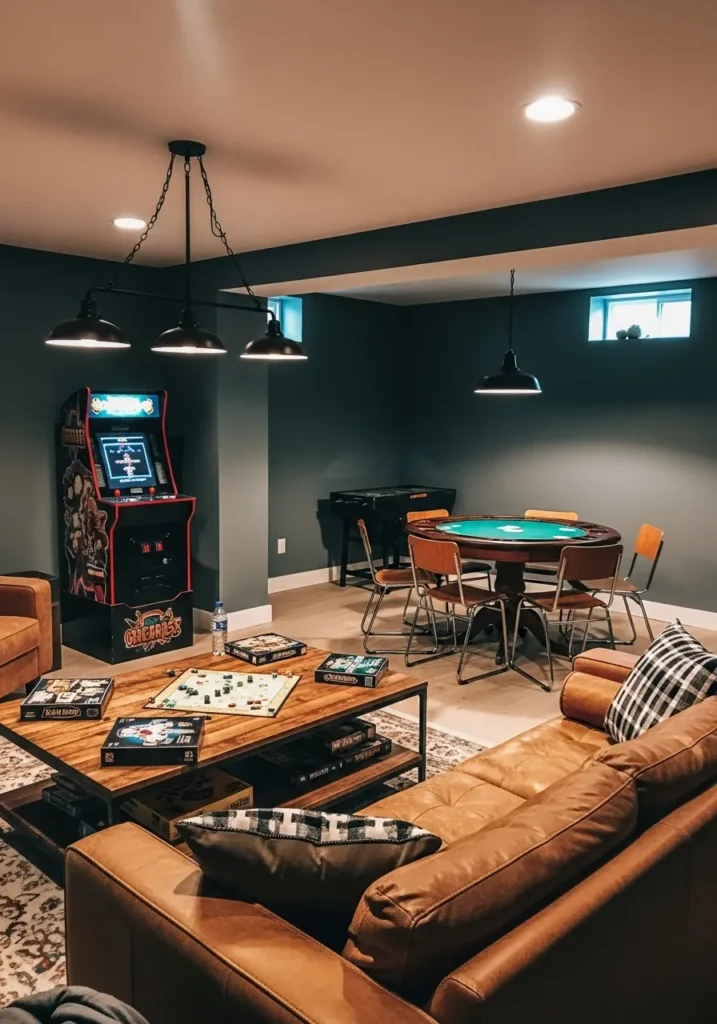 This basement game room uses a muted green wall color that feels relaxed and welcoming for long game nights. The tone adds personality without overpowering the space and works beautifully with warm wood floors and simple seating. Everything feels grounded and comfortable which is perfect for entertaining.