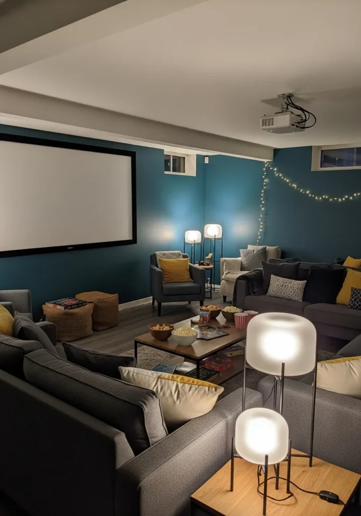 Charcoal Blue Basement Theater Room