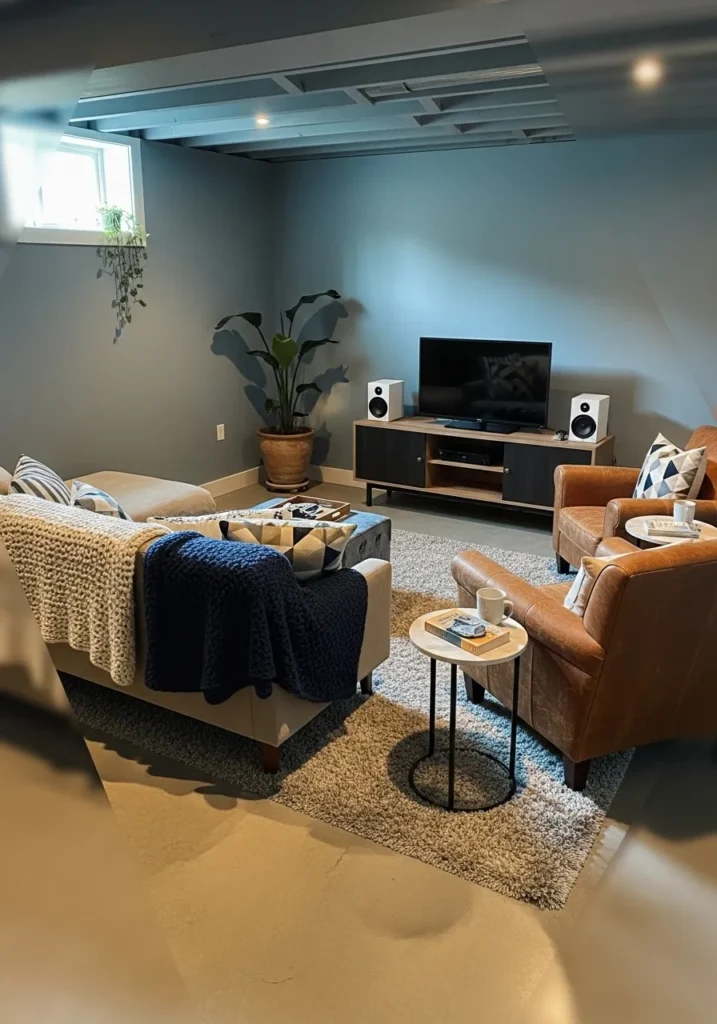This basement hangout space uses a blue green wall color that feels calm yet lively. The tone works well with the media setup and comfortable seating, keeping the room social and inviting. Soft lighting helps balance the color beautifully.