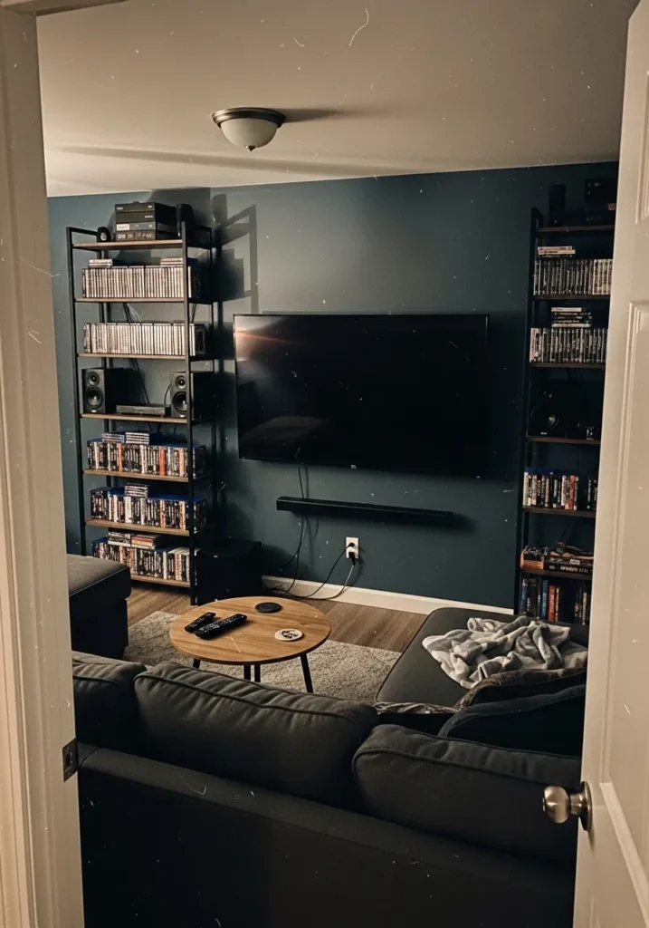 I love how fun this room feels. The color makes movie nights feel special and intentional. It feels perfect for entertaining without trying too hard.