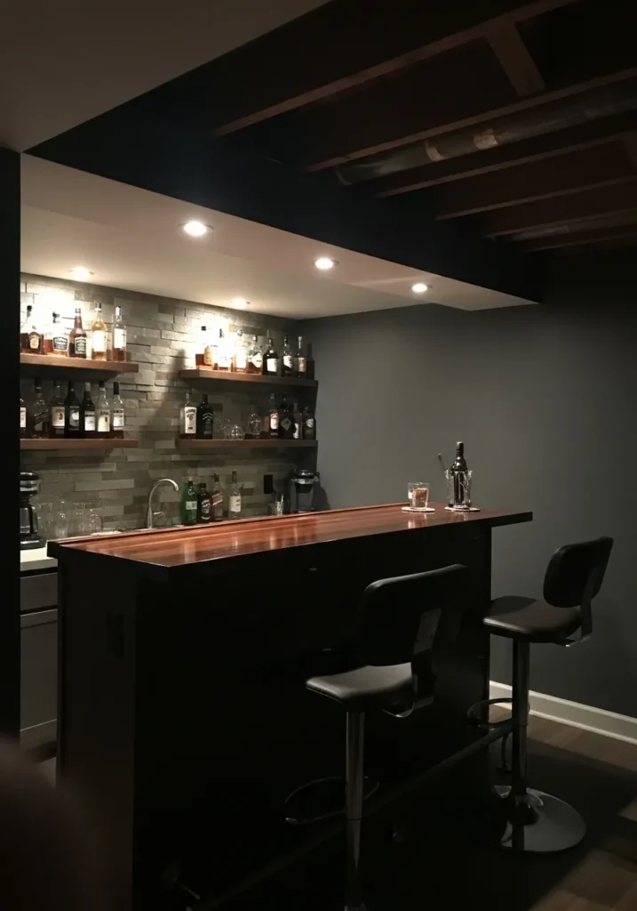 This basement bar is painted in a dark slate tone that sets a moody and polished vibe. The color pairs beautifully with stone textures, wood counters, and soft bar lighting. It gives the space a cozy lounge feel while still looking sleek and put together.