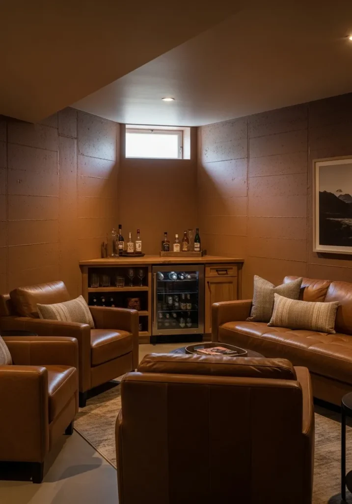 Warm Brown Basement Lounge With Bar