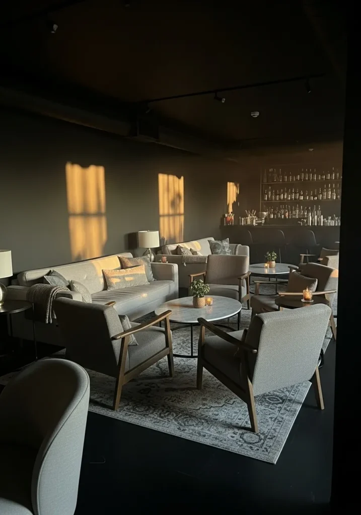 This wine lounge features rich dark walls that create a cozy and intimate setting. The color pairs perfectly with wood shelving and soft seating, giving the room a warm and layered feel. It feels quiet and refined without being formal.