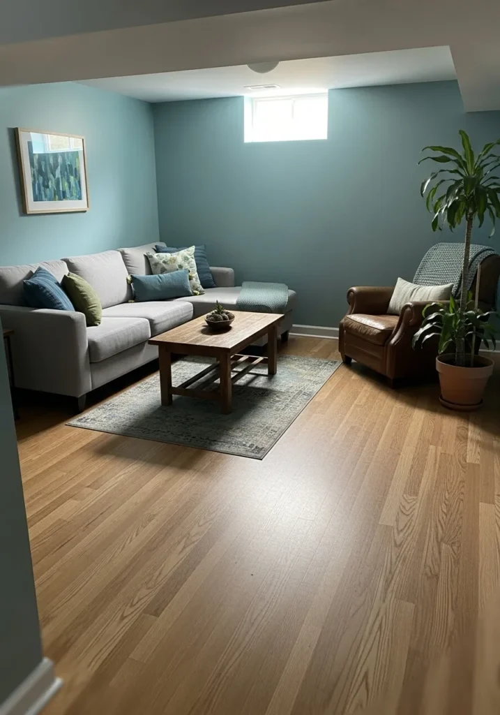 This basement lounge is painted in a muted teal that feels calm and soothing. The color adds depth while still keeping the space relaxed and comfortable. Natural light and warm wood floors help balance the cooler tone.