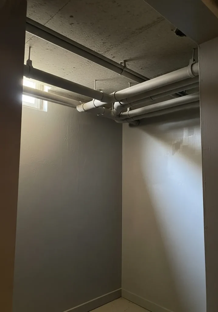 This unfinished basement space is painted in a soft gray that takes the edge off exposed ceilings and utilities. The color helps the room feel calmer and more put together. Light reflects nicely off the walls which keeps the space from feeling cold.