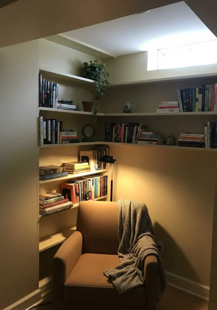 This basement book nook is painted in a warm neutral shade that feels gentle and inviting. Built in shelves blend into the walls which keeps the space feeling calm and uncluttered. Soft lighting adds to the cozy atmosphere.