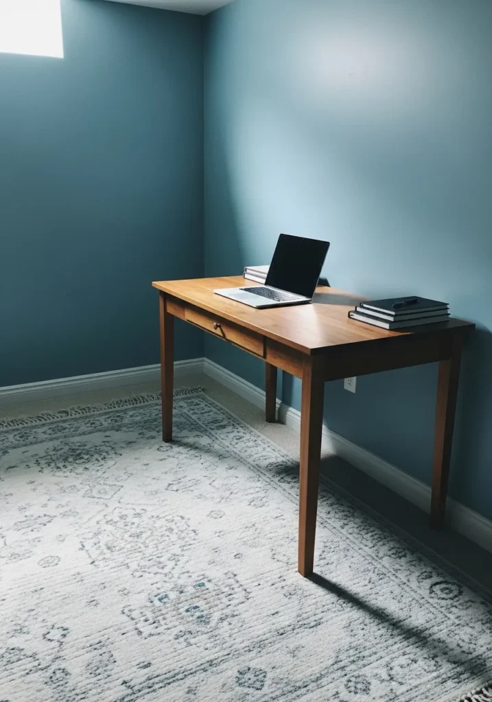 This basement office uses a dusty blue paint that feels calm and focused. The color adds a soft cocoon effect without making the room feel dark. Simple furniture and light flooring keep everything balanced.