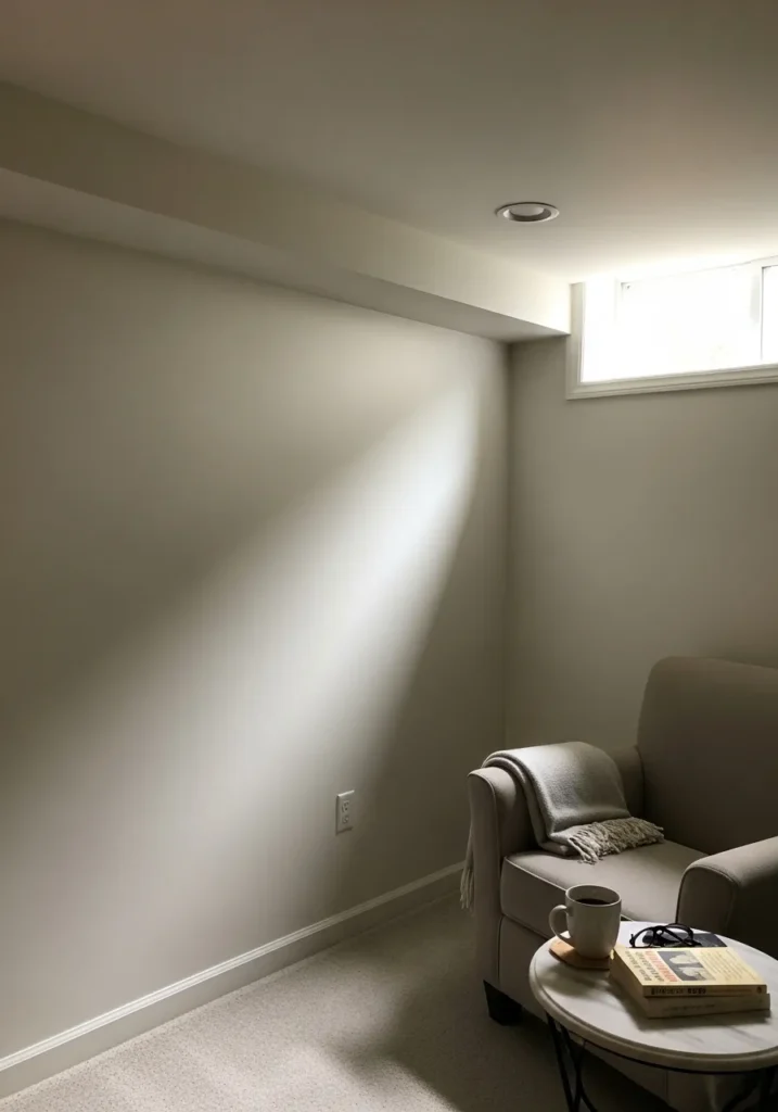 This basement seating nook is painted in a soft stone shade that keeps the space feeling calm and relaxed. The light neutral walls gently reflect light from the small window, helping the room feel cozy without closing it in. Simple furniture and warm textures make the space feel easy and unforced.