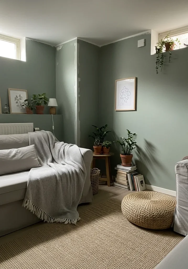 This quiet basement nook is painted in a soft olive tone that instantly creates a calm and cozy feeling. The muted color wraps the space gently and works perfectly with built in shelving and simple decor. Natural light from the small window warms everything up.