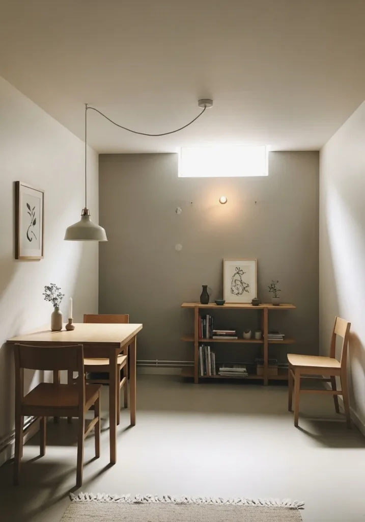 This basement dining space uses a soft cream paint that brightens the room while keeping it calm. The walls reflect light gently which helps the space feel open and inviting. Simple furniture keeps the look relaxed and comfortable.