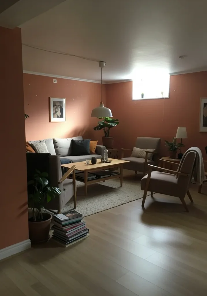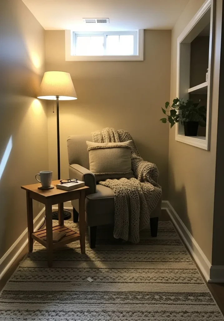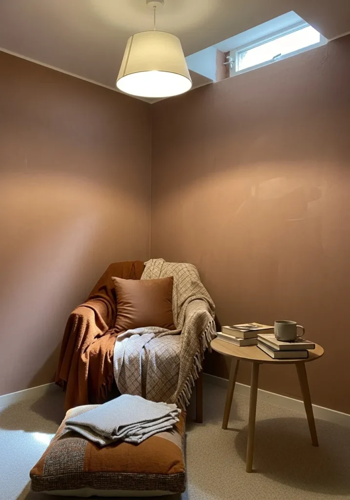 This cozy basement corner is painted in a warm caramel shade that instantly wraps the space in comfort. The color works beautifully with soft textiles and warm lighting, making the small area feel intentional and snug rather than tight. The walls absorb light gently which adds to the relaxed mood.