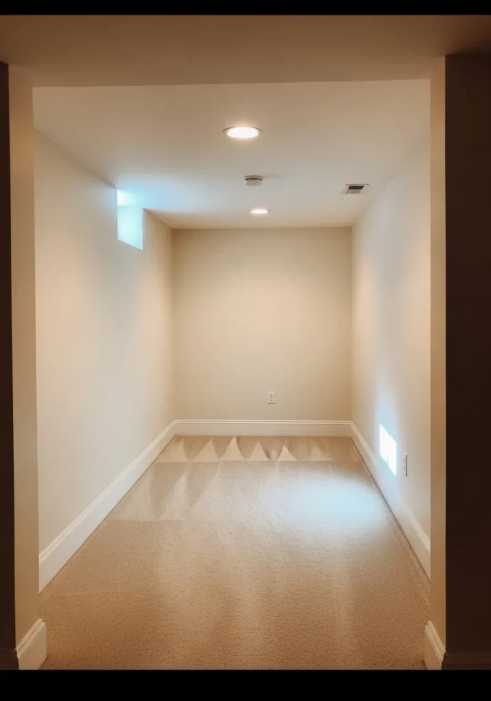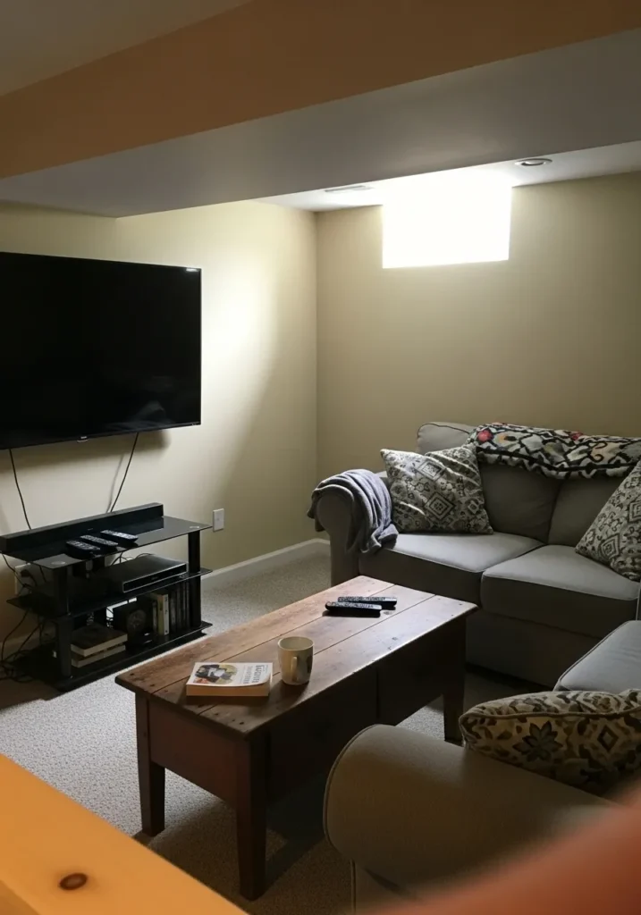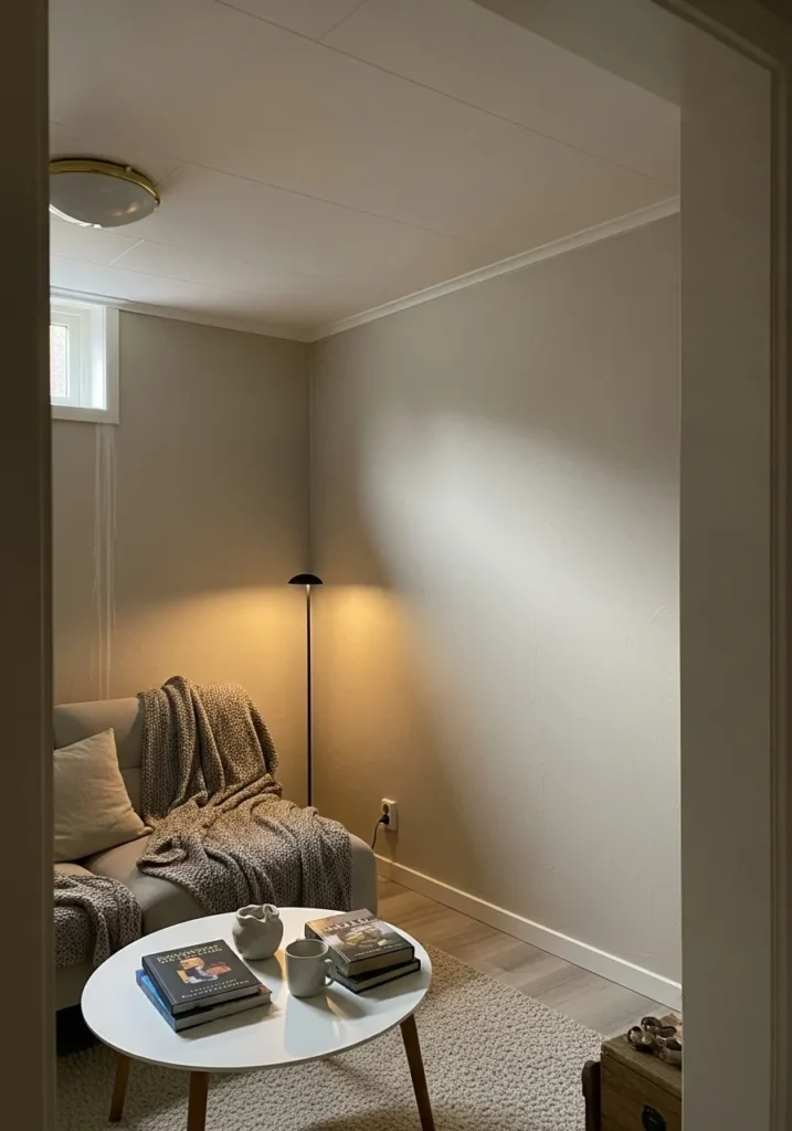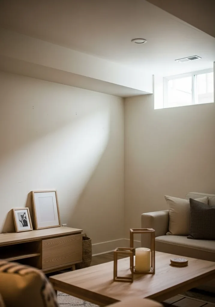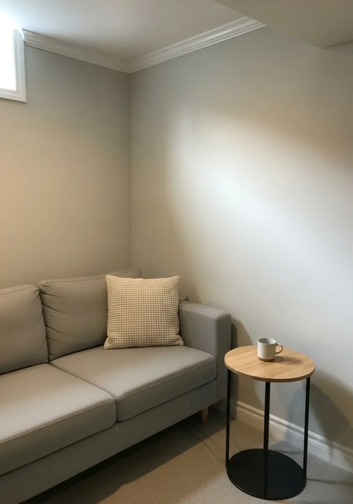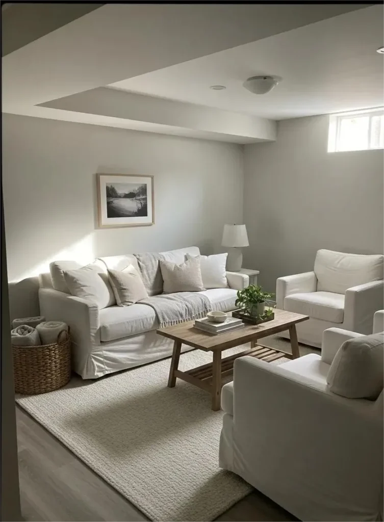 This basement living area features soft off white walls that instantly lift the room. The color works beautifully with minimal furniture and keeps the space feeling open. Light from the small window spreads evenly across the walls.