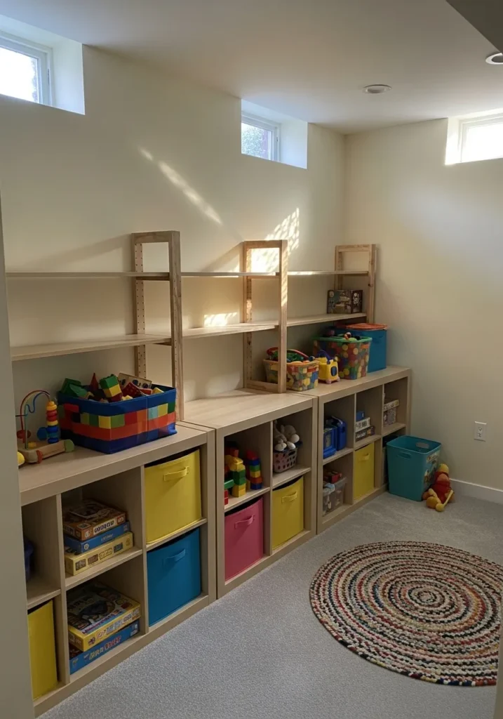 This basement playroom uses a bright off white paint that lifts the entire room. The walls reflect both ceiling light and window light which keeps the space feeling cheerful and open. Storage units stand out nicely without making the room feel busy.
