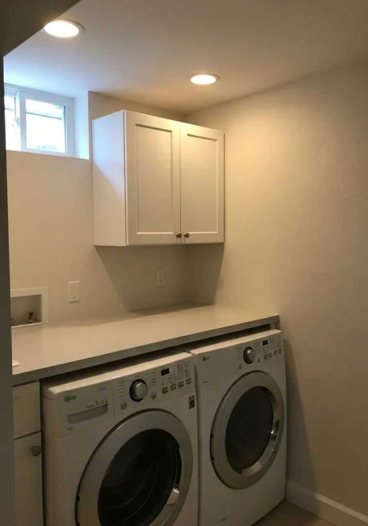 This basement laundry room features a clean light neutral paint that brightens the space instantly. The walls reflect ceiling light evenly and help cabinetry feel lighter and more open. Everything feels fresh and organized despite the compact layout.