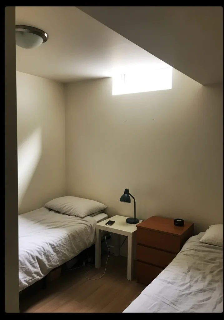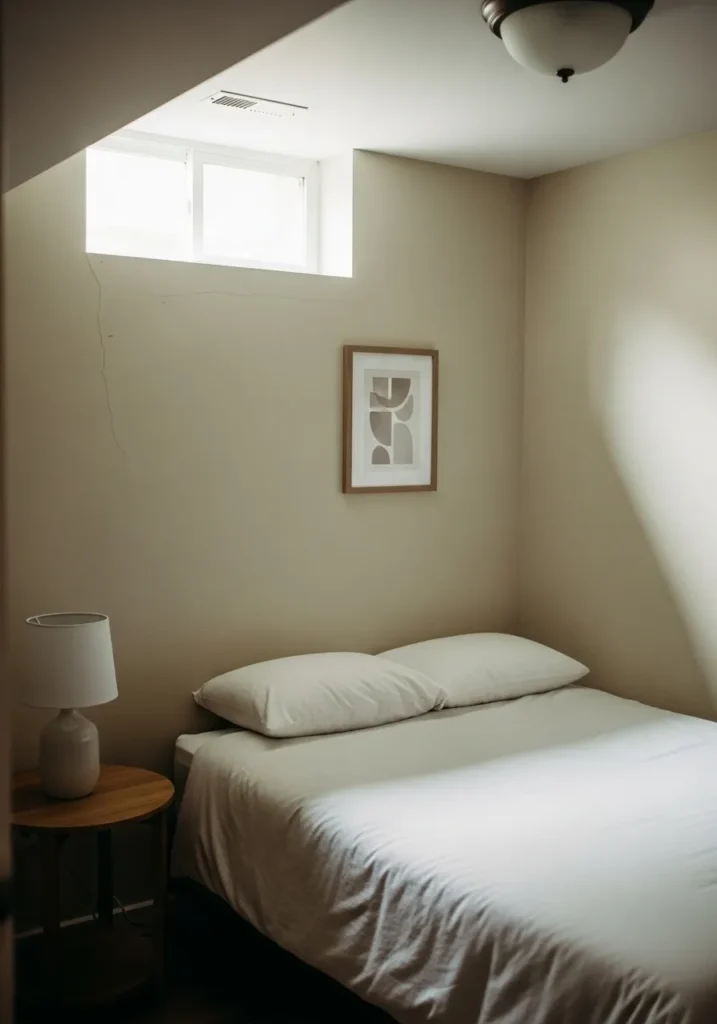 I find this space surprisingly soothing. The paint makes the bedroom feel calm and livable. It proves that small basement rooms can still feel peaceful.