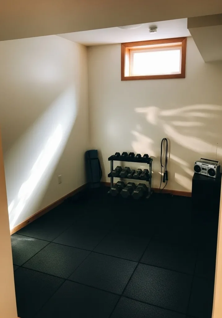 This basement gym uses a pale neutral paint that keeps the room feeling open and energized. The walls reflect light evenly and help prevent the space from feeling heavy. Dark flooring stands out cleanly against the light walls.