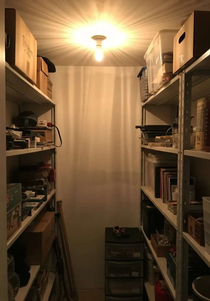 This basement storage corridor is painted in a light neutral that instantly brightens the narrow layout. The walls reflect ceiling lights and help the space feel longer and less cramped. Shelving feels more organized against the soft color.