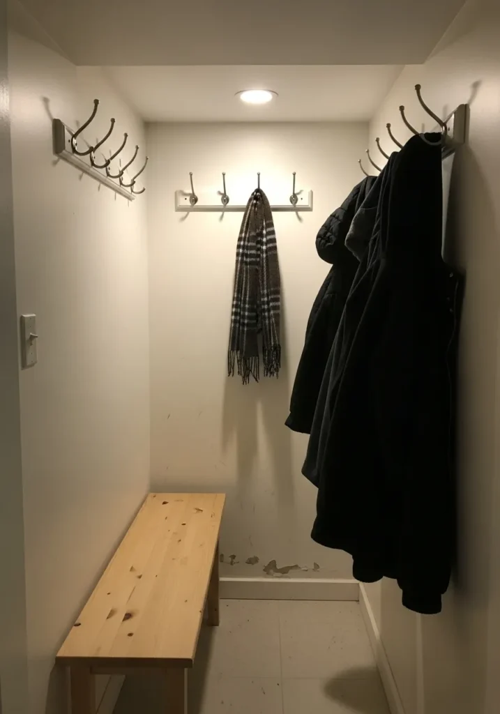 This small basement entry area uses a soft neutral paint that keeps the narrow space feeling light and uncluttered. The walls reflect overhead lighting evenly and prevent shadows from taking over. Simple hooks and a bench stand out clearly against the light background.