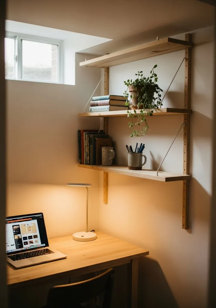This basement work corner features soft off white walls that glow under warm desk lighting. The color reflects light gently and helps the shelves and desk feel lighter and more open. The space feels cozy but not closed in.