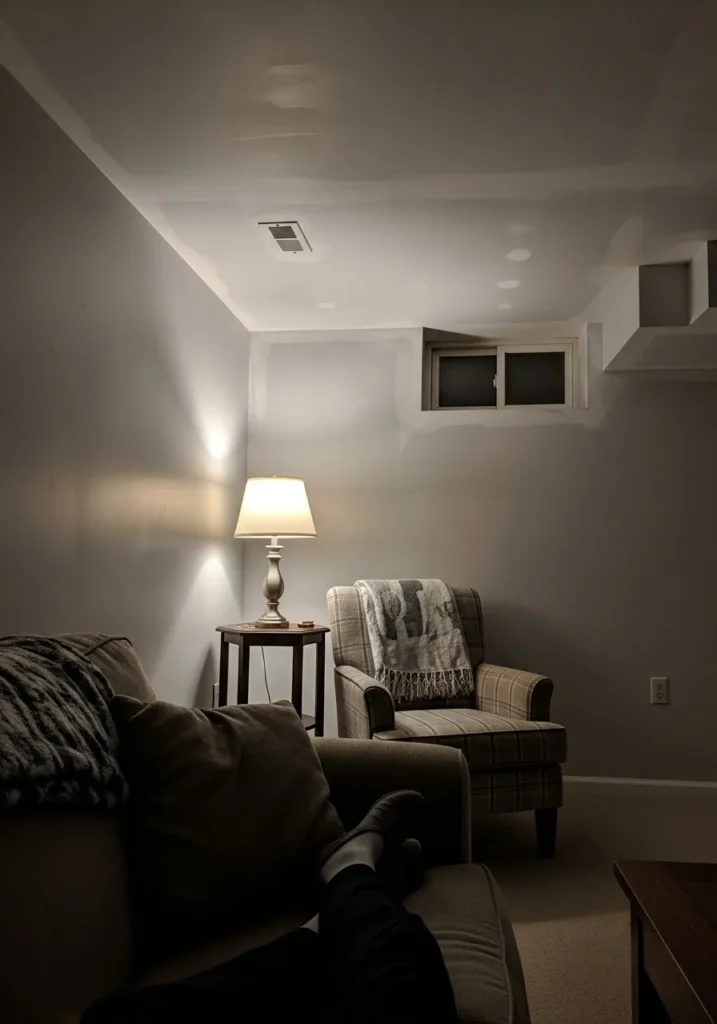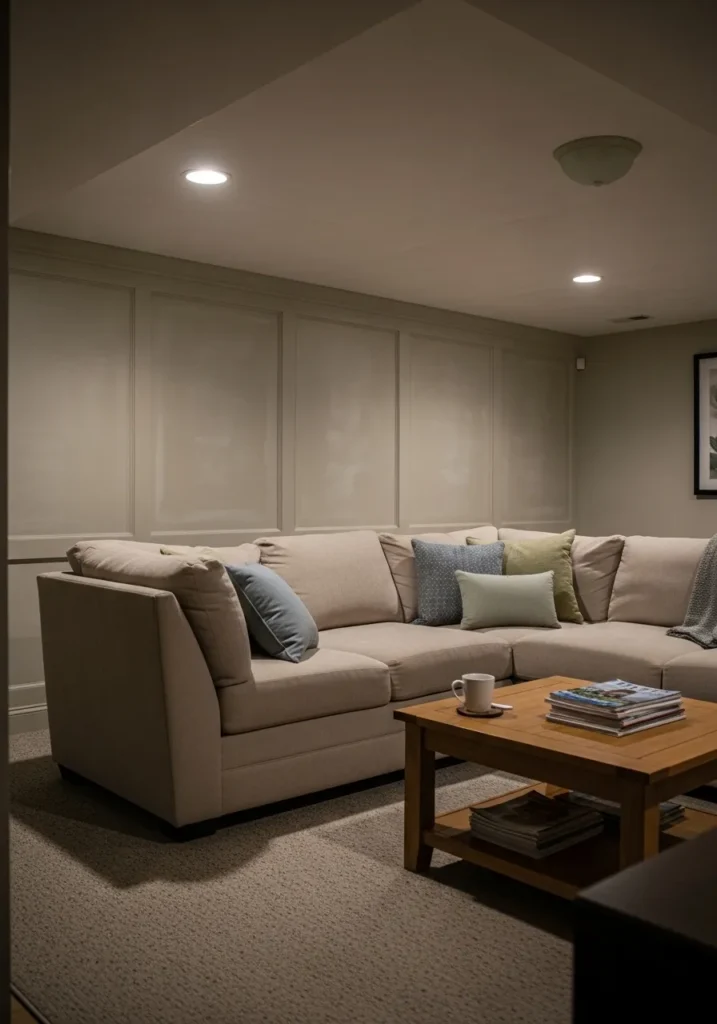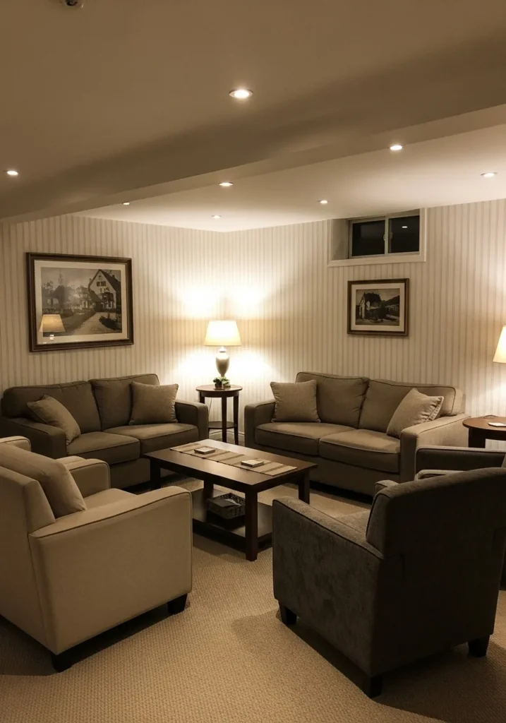 Cozy Basement Lounge With Warm Neutral Walls