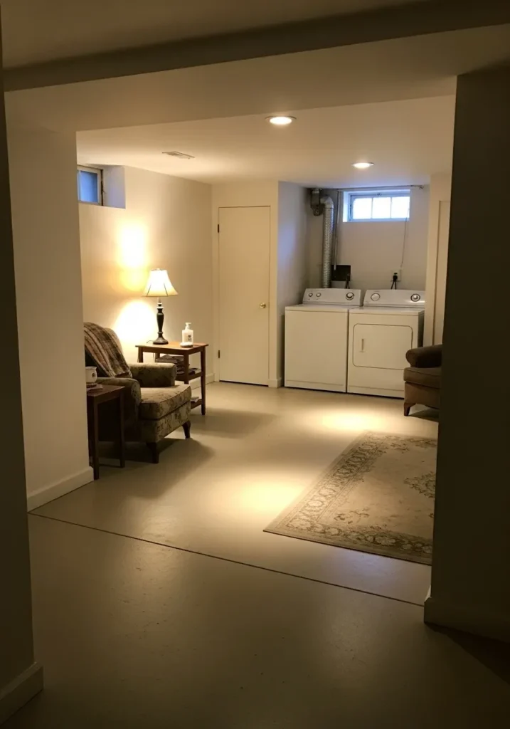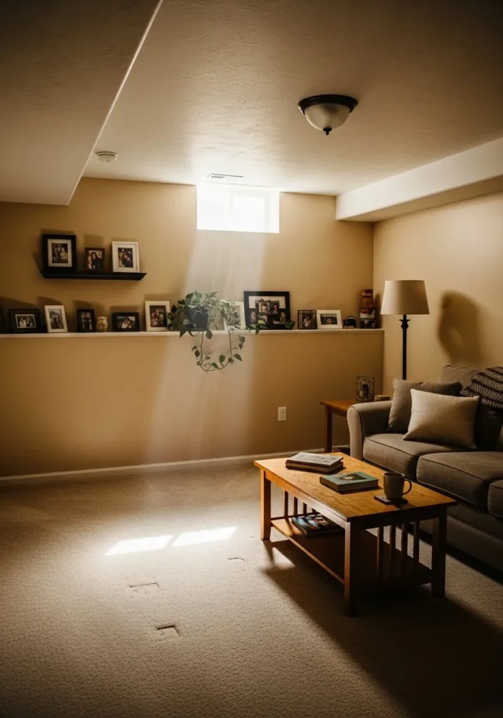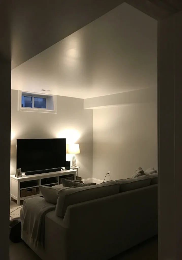This basement living area features warm beige walls paired with soft lighting and low furniture that keeps the sightlines open.