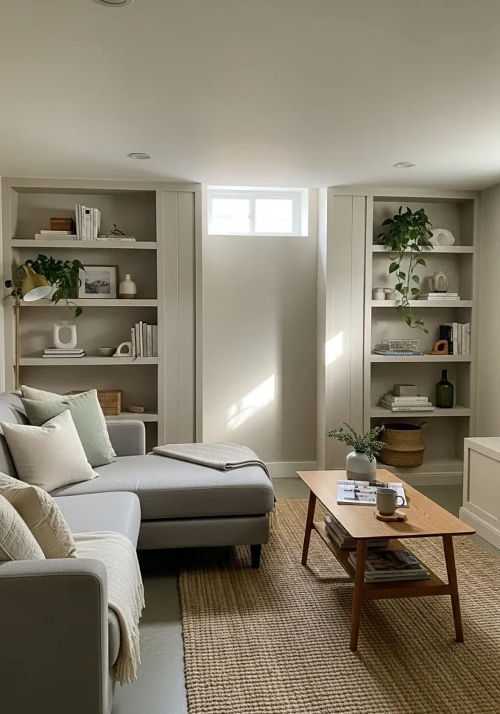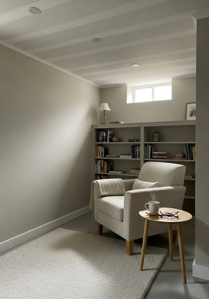 This basement uses a pale neutral paint that reflects natural light from the small window and spreads it gently across the walls and ceiling.