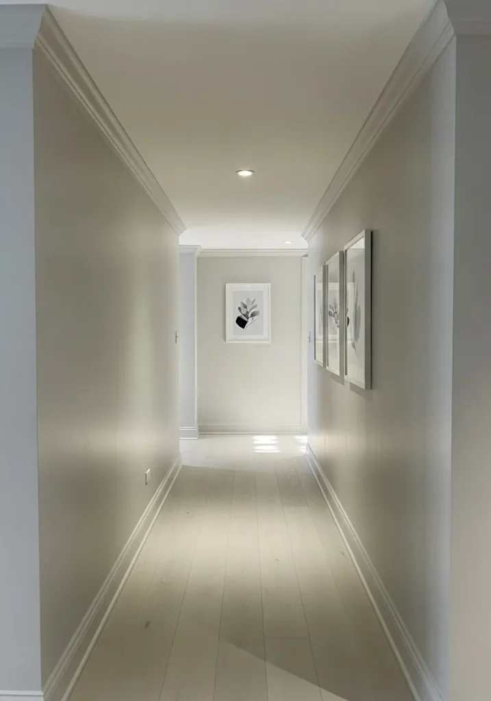 This basement hallway is painted in a bright neutral shade that reflects light from end to end.