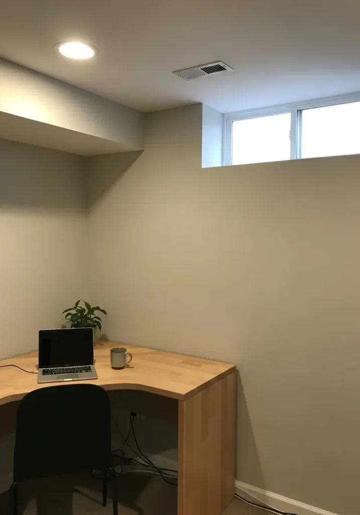 Basement Workspace With Soft Neutral Walls