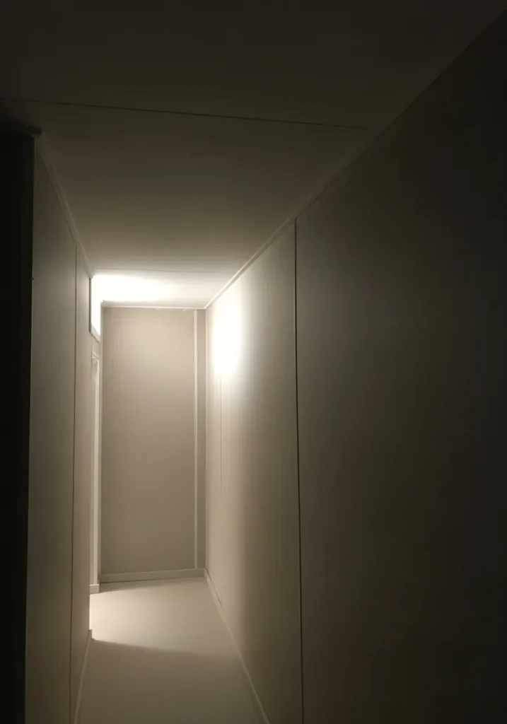The light tone works beautifully with the low ceiling and exposed elements, helping the walls feel taller and the transition area feel more open and breathable.
