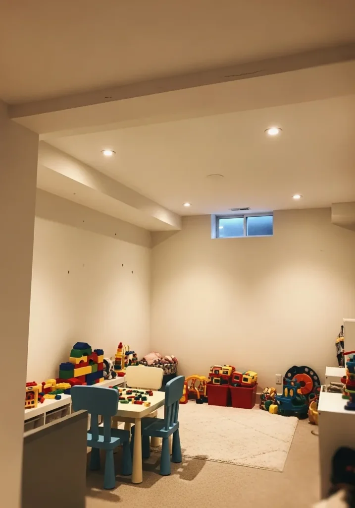 This basement playroom is painted in a bright neutral shade that keeps the space feeling cheerful and open.