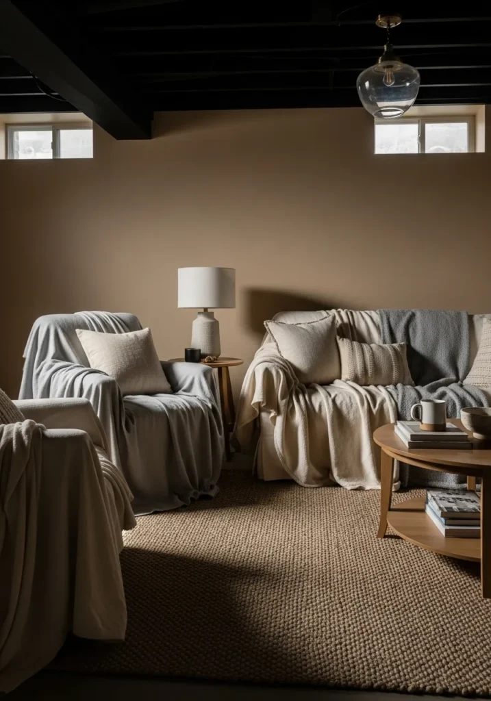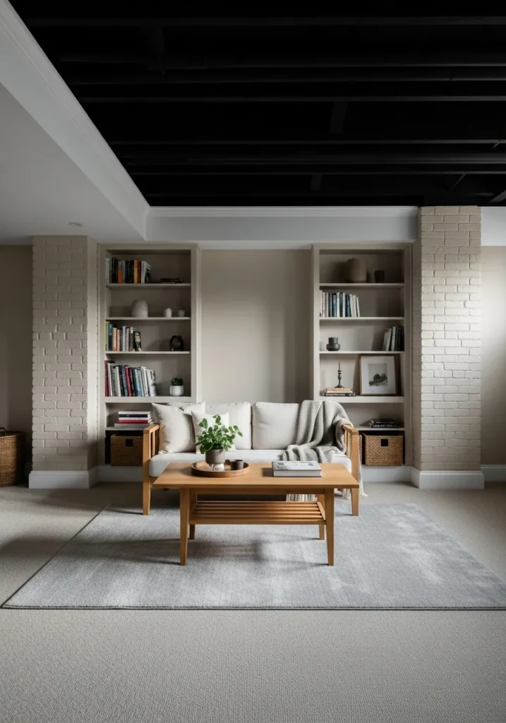 This basement living room pairs a soft neutral wall color with a bold black ceiling that instantly grounds the space. Built in shelving, light wood furniture, and a textured area rug keep the room feeling warm instead of heavy. The ceiling beams fade into the background while the lighter walls bounce light around the room and make it feel more open.