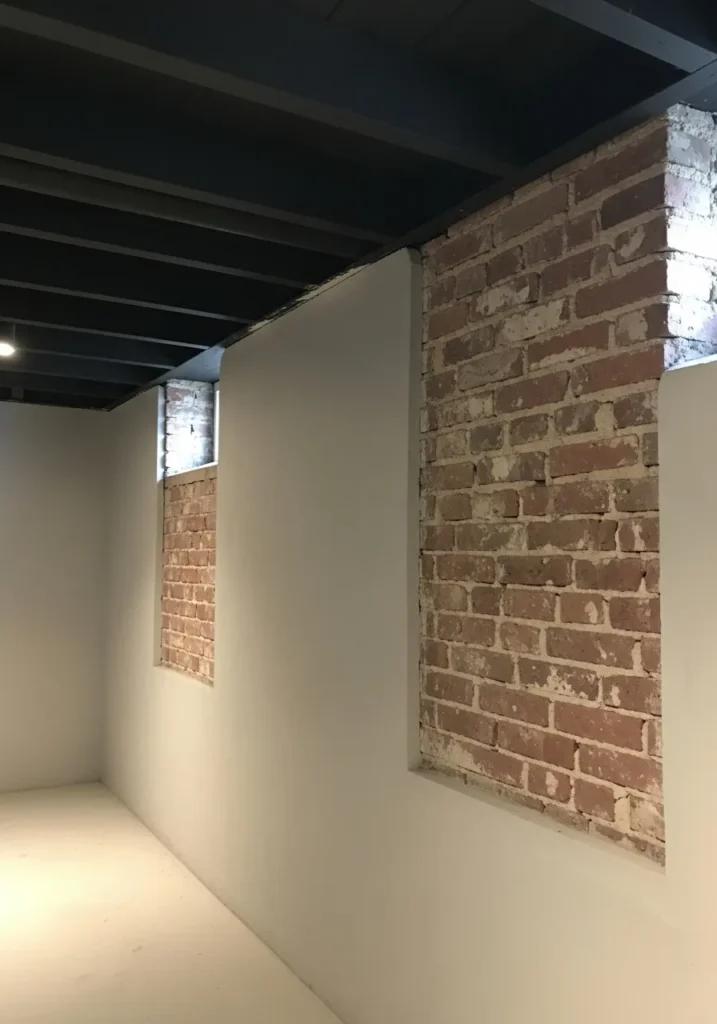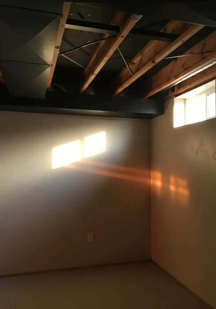 This open basement space features an exposed black ceiling that highlights the structure above while leaving plenty of room for future design ideas. Soft neutral walls reflect the light coming through the small windows, and the dark ceiling keeps everything from feeling washed out. It feels raw but full of possibility.