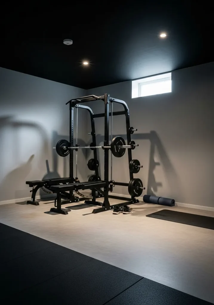 This basement gym uses a black ceiling to ground the space and make the workout area feel defined. Light walls and flooring keep things bright, while the ceiling adds contrast and hides fixtures beautifully. The overall look feels clean, focused, and surprisingly polished.