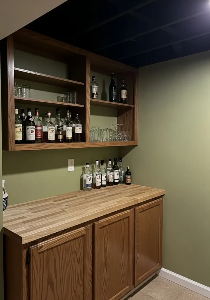 This compact basement bar pairs a black ceiling with warm wood cabinetry and soft wall colors. Open shelving and simple lighting keep the space functional while the ceiling adds a moody, upscale feel. It feels like a cozy corner designed for slow evenings.